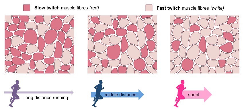 Neandertalare (Homo neanderthalensis) tros ha haft en något högre andel ”fast-twitch” (typ II) fibrer då de jagade stora byten som var kraftfulla. Deras benbyggnad var också kraftigare, med tjockare skaft på lårben och överarmsben för att hantera dessa höga belastningar av att bära sina vapen & kött från byten. Förr var överlevnad mycket svårare än idag då man var konstant i jagande och jagad av andra rovdjur bara för att kunna äta och leva en dag till. I dag behöver man klara en tenta för att kunna ha lunch i ett par månader.
