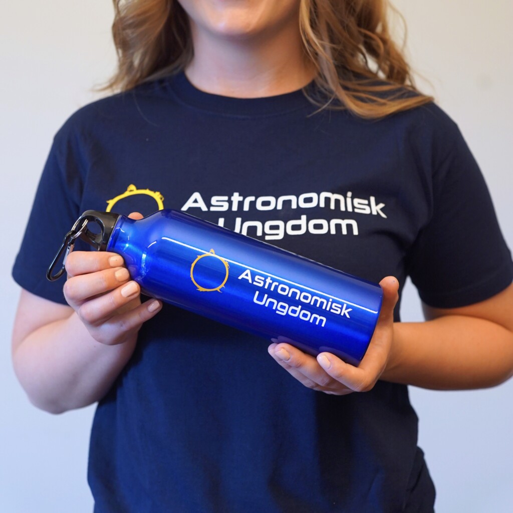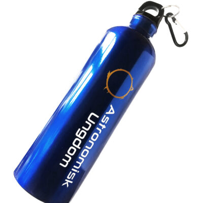 Marinblå vattenflaska i aluminium med skruvkork och karbinhake. Volym 0,77 liter. Logotyp på framsidan och på baksidan citatet ”The surface of the Earth is the shore of the cosmic ocean. On this shore, we’ve learned most of what we know. Recently, we’ve waded a little way out, maybe ankle-deep, and the water seems inviting.” – Carl Sagan